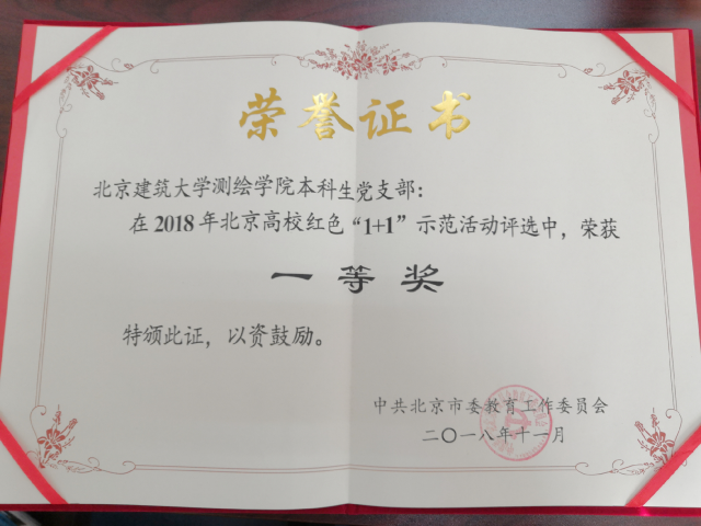 11月28日下午,2018年北京高校红色“1+1”示范活动展示评选会在北京化工大学举行。市委教工委组织处、市委农工委组织处、团市委大学部、市委教工委宣教处、首都文明办未成年人工作处、市委宣传部宣传处等相关工作负责人应邀担任评委,各高校主管部门负责人、学生党支部代表、媒体代表共400余人参加。本次评选会共有25支队伍参赛,这些代表队是从参加评选的北京高校1300多个学生党支部中遴选出的,分别来自北京大学、清华大学、北京科技大学、北京师范大学等高校。经过视频展示和紧张的答辩环节,代表我校参加的测绘学院本科生党支部荣获2018年北京高校红色“1+1”示范活动一等奖,实现了我校在该项评比中连续四年获得一等奖的佳绩。