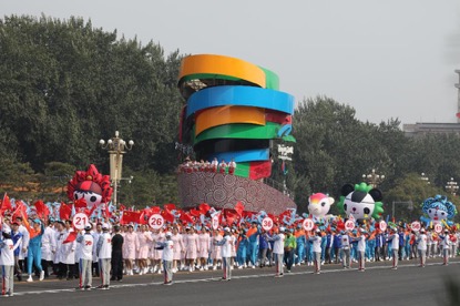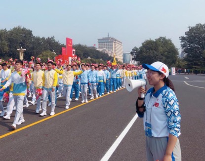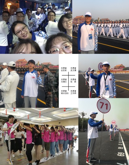 经过44天的刻苦训练,终于迎来了国庆阅兵仪式,由10万群众、70组彩车组成的36个方阵在长安街上载歌载舞地行进,他们保持着队形的整体性,这离不开我们的志愿者。志愿者的具体工作分队形定点定位志愿者和机动志愿者。定点志愿者举牌为游行队伍提供排数标识,方便游行队伍快速找到自己对应的排数,使排面标齐。我院研究生所在的南侧是每隔五排站一位志愿者。因为每个方队中排与排之间的距离不一样,定点志愿者就需要根据游行方阵的需求改变位置,不停地奔跑。机动志愿者则需要在一旁做辅助工作,在队伍旁游走、喊话:“请标齐排面,向右看齐”等提醒游行队伍保持整齐。