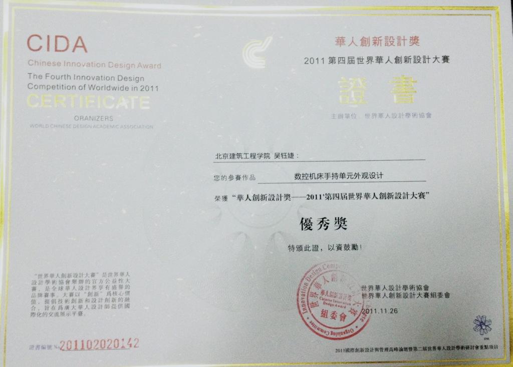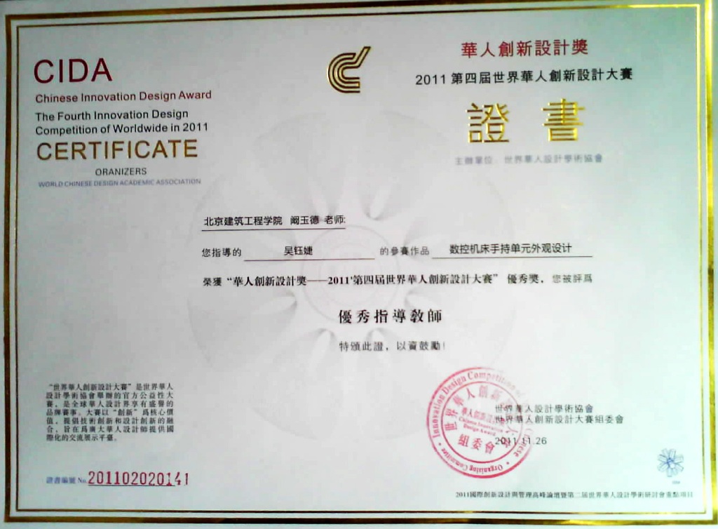 据第四届世界华人创新设计大赛主办方介绍,本届比赛融入了全新的组织理念和国际化的评审标准,自2011年10月启动以来,国内外多所相关设计院校学生参与赛事,共面向全球华人设计师征集到了 4000多幅作品,最终评选出了优秀奖及其以上奖项共76幅。在该赛事中,由我院教师阚玉德指导设计艺术研究生吴钰婕设计的作品《数控机床手持单元外观设计》,获得“华人创新设计奖-优秀奖”,同时指导教师获得“华人创新设计奖-优秀指导教师”奖,这是我院首次在世界华人创新设计大赛中获奖。