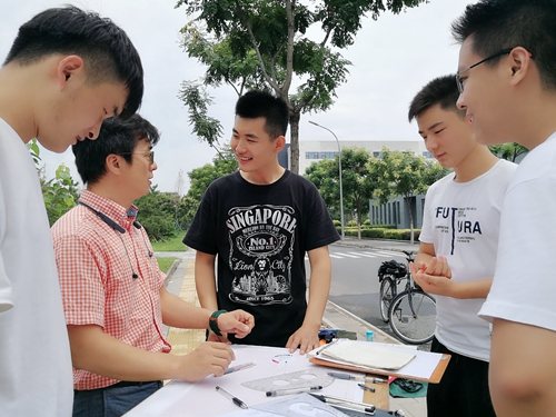 林立的楼宇,纵横的街巷,都是我们研究的主体。在巨大的城市模型前,建筑学院范霄鹏、魏菲宇两位老师,或蹲或站,正在指导学生运用“四度空间”进行数据抽象的类城市空间规划设计课程实践。