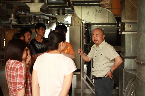 低矮、狭小的楼宇顶层是环能学院供热、通风及空调工程专业《专业认识实习》课程的教学现场之一,郝学军老师正在中法能源中心为08级本科生进行现场教学,如今照片中的学生已经进入设计院、燃气集团等行业单位工作。