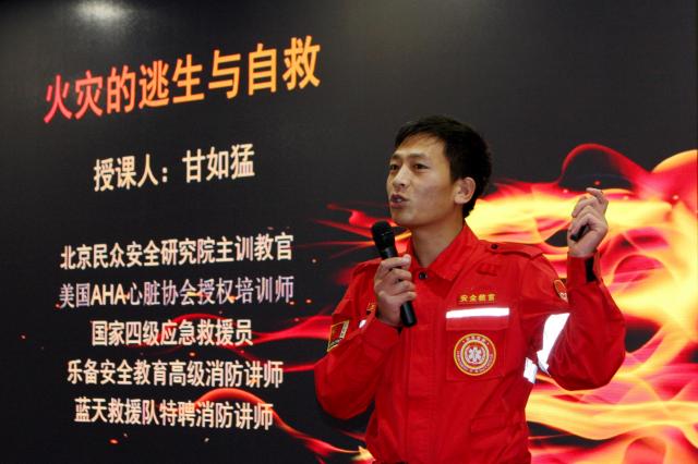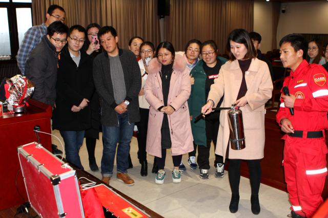 北京民众安全应急救援研究院主训教官、国家四级应急救援员甘如猛应邀为新教工讲解火灾逃生与自救知识,综合使用火灾应急模拟电子教具让新教工现场学习体验消防器材的使用技巧。