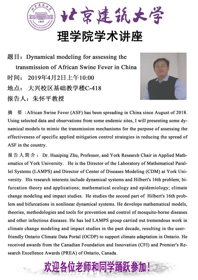 学院公告 学院公告 您当前的位置: 首页» 学院公告 理学院学术讲座——Dynamical modeling for assessing the transmission of African Swine Fever in China 供稿: | 审核: | 摄影: | 发布日期:2020-04-23