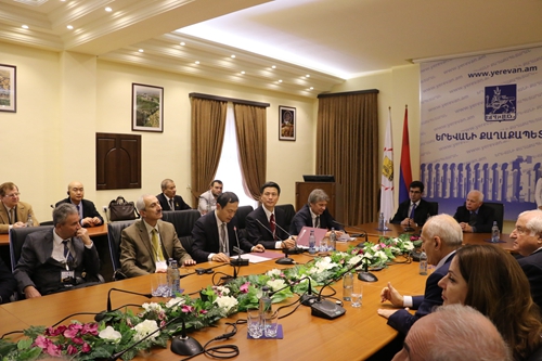 26日上午,代表团在亚美尼亚首都埃里温市市政厅出席亚美尼亚国立建筑大学95周年校庆师生成果展开幕式,开幕式上埃里温市长Taron Margaryan及校长Gagik Galstyan讲话。张爱林接受了亚美尼亚国家电视台的现场采访,他代表开云电竞pg软件对亚美尼亚国立建筑大学95周年校庆表示祝贺,对亚美尼亚国立建筑大学师生们长期努力所取得的丰硕成果表示钦佩。张爱林说,中国和亚美尼亚两国有着悠久的传统友谊,开云电竞pg软件和亚美尼亚国立建筑大学有着长期友好的合作,特别是成功地联合承办了八届土木与建筑热点问题国际研讨会,中国实施“一带一路”发展战略以及中国的城乡建设向“绿色化、信息化、工业化、宜居化”转型升级为双方合作提供了前所未有的重大机遇,双方未来合作前景广阔。