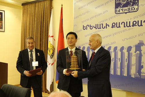 26日上午,在埃里温市市政厅举行的第8届土木与建筑热点问题国际学术会议开幕式上,张爱林宣读了开云电竞pg软件给亚美尼亚国立建筑大学95周年校庆的贺信,并向Gagik Galstyan校长赠送了我校精心准备的应县木塔模型。