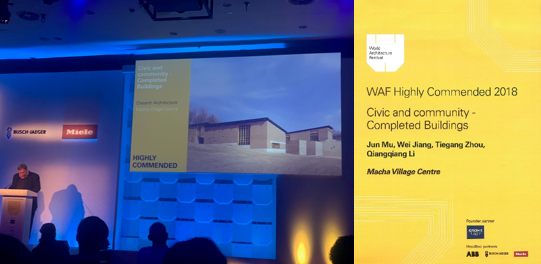 由于参与项目众多,今年的现场角逐异常激烈。最终,穆钧教授、蒋蔚老师率队完成的“马岔村民活动中心”项目,荣获“公民与社区-建成项目”类别(Civil and Community)的佳作奖(Highly Commended Award),与“如恩设计”(获得“酒店休闲-建成项目”类别的佳作奖)、“GOA大象设计”(获得“休闲-未建成项目”类别的佳作奖)一同成为建筑设计大类中,最终获得奖项仅有的3个中国团队。