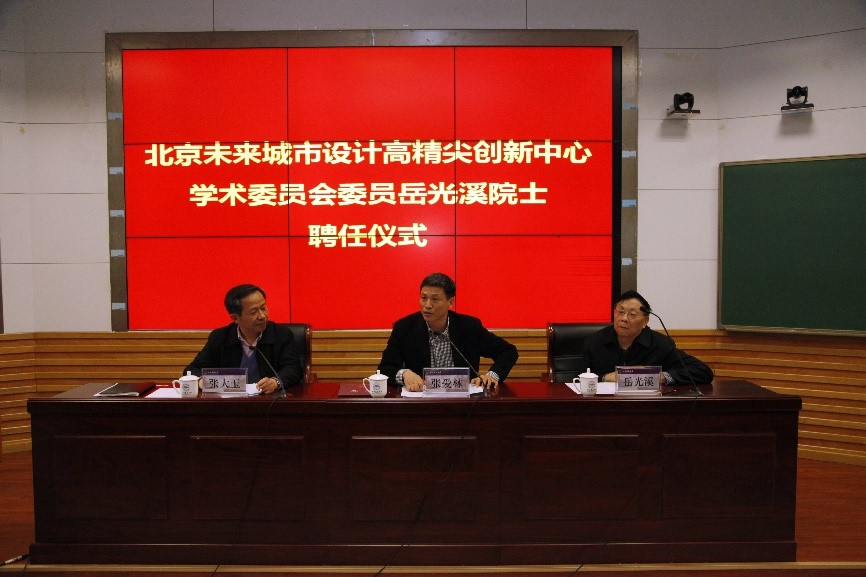 副校长张大玉主持聘任仪式。张爱林校长代表学校向岳光溪院士颁发了北京“未来城市设计高精尖创新中心”学术委员会委员聘书。