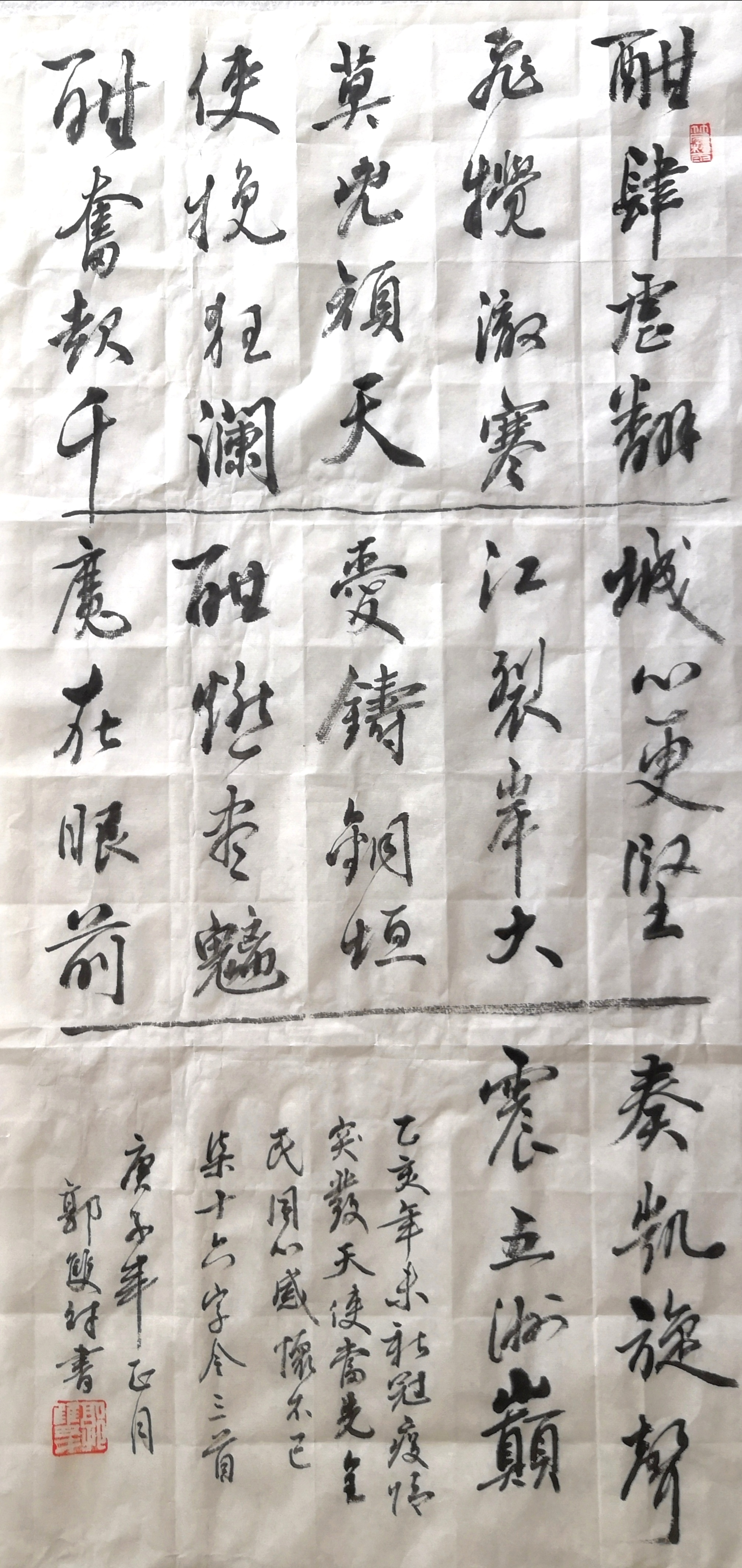 作品介绍:病毒肆虐狼烟升,鄂汉危难举国惊。亿万炎黄齐动员,捐钱捐物又出工。长空隆隆天兵到,大地滚滚車如洪。白衣战士冲在前,旌旗一片斩恶魔。扫尽阴霾艳阳照,人民安居更幸福。