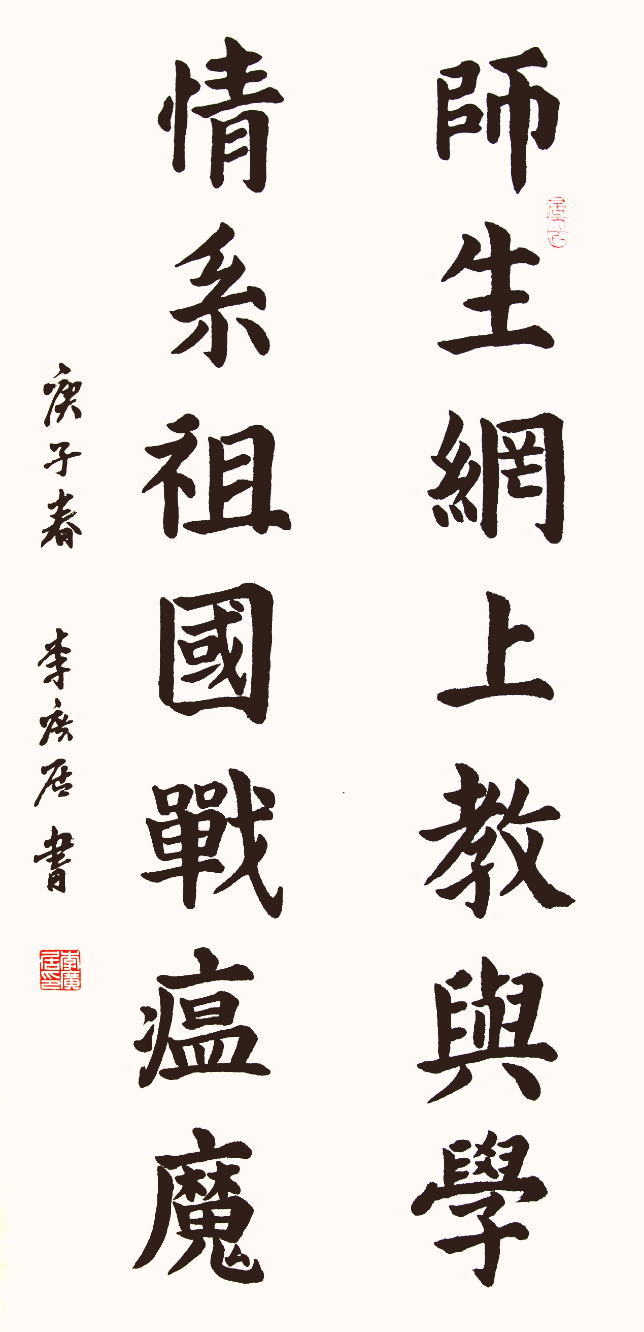 作品介绍:寒冬抗疫校园封,线上教学解惑忙。待到新冠消灭日,师生欢聚共春光。