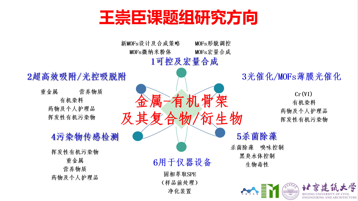 主要研究以金属-有机骨架(MOFs)材料为主的环境修复材料设计、合成和应用。实现了部分MOFs低成本宏量生产。将MOFs及其复合物/衍生物用于传感检测、高级氧化去除(含光催化、光芬顿和活化硫酸根自由基)和吸附(传统吸附和光控吸脱附)去除环境新兴污染物,同时深入研究了反应路径及反应机理。主持国家自然科学基金面上项目、北京自然科学基金重点项目暨北京市教委重点项目、北京社科基金重点项目、北京市自然科学基金面上项目、北京市教委面上项目、北京市教委特色资源库项目、北京百千万人才经费资助项目(连续5年获得资助)、北京市教委长城学者培养计划项目、北京市教委青年拔尖开云电竞注册登录入口计划项目等科研项目。作为学术骨干,参与国家自然科学基金、水体污染控制与治理科技重大专项、可持续水与废物循环利用创新团队、城市雨水系统与水环境生态技术创新团队和建筑遗产保护与发展关键技术高水平创新团队等。