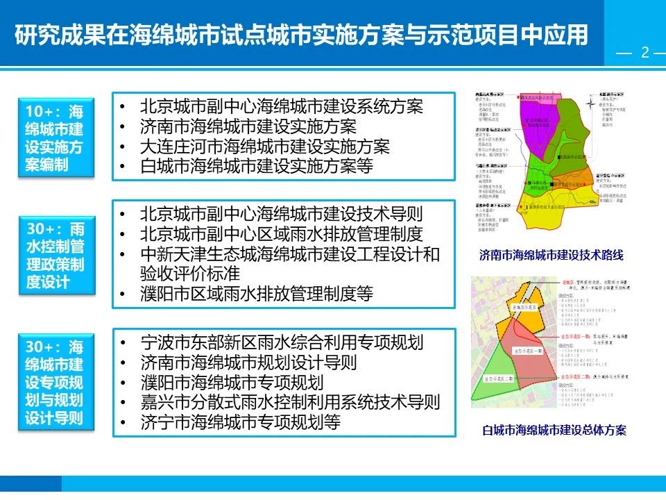 近年来,结合城市雨水控制和水环境生态系统构建领域研究成果,先后主持完成包括低影响开发与绿色雨水基础设施、径流污染与CSO污染控制、内涝控制、雨水资源化、绿色建筑水系统、历史城镇水环境保护等在内的工程实践项目数十项,多项研究成果在国家海绵城市试点城市、城市内涝防治和黑臭水体治理补短板中广泛应用,效益显著。承担了北京、济南、大连、白城等多个城市海绵城市建设的技术咨询和监测评估工作。多项成果及应用参加国家“十二五”重大科技创新成就展。